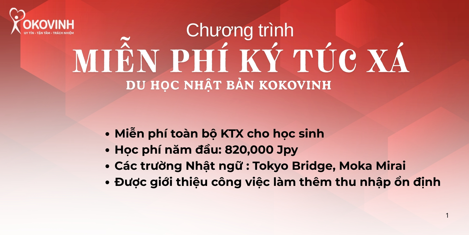 Chương trình du học tự túc miễn kí túc xá là chương trình hỗ trợ nhà ở cho học sinh, giúp học sinh khi sang Nhật có thể yên tâm học tập và giảm được một phần gánh nặng tiền bạc khi sinh sống ở Nhật. Ngoài ra khi tham gia chương trình học sinh còn được nhà trường giới thiệu công việc làm thêm phù hợp với nguyện vọng và năng lực tiếng Nhật của từng học sinh.